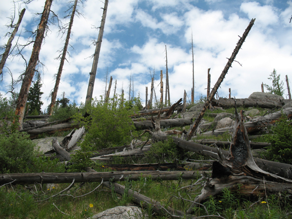 On trails near Mount Evans,  trunks lie on the earth like soldiers felled in battle.  While hiking to Chicago Lakes and maneuvering around and over the burnt trees, I noticed wildflowers and other shoots springing up in between.  It was the perfect visual for meditation, the slow creation of new neural pathways to bypass mental and emotional ruts, and also humbling to realize that it could take generations for the fresh growth to eclipse the blackened forest, for the evidence of fire to completely disappear.