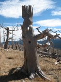 Through hiking, I’ve had to adjust my mental images of this state.  Some of the most stunning landscapes I’ve traversed are filled with dead trees,  their leaves and branches incinerated by fire and the trunks scoured by snow, rain and fierce wind.  Mother Nature has sculpted them into stark totems, silent witnesses to the cycles of growth and destruction.