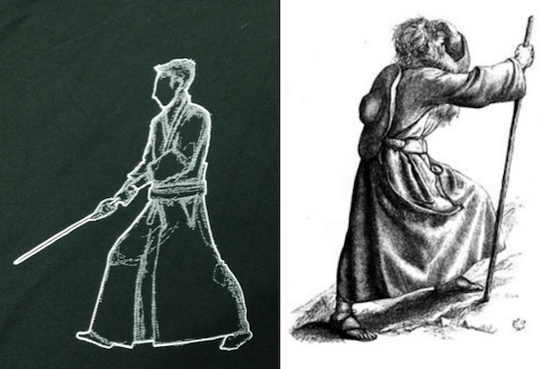 It wasn’t until I hung my sweaty uniform by the window to air it out that I found a context for the situation. Suddenly, I was back on El Camino de Santiago, draping my clothing across a bunkbed in a charmless room. Indeed, if I had been assigned a private room with a mirror and sink during my pilgrimage, I probably would have been ecstatic, not dispirited. Perhaps the online photo had planted a seed I shouldn’t have let bloom in my imagination. That is one reason why, when I walked El Camino, I didn’t read about what I’d be seeing in the upcoming days. I wanted to be surprised and to take things as they came, rather than suffer disappointment after a buildup. Would the same strategy have worked here? Before going to sleep I took a closer look at the t-shirt I’d received. The front featured the sponsoring dojo’s logo. An illustration of an Aikidoka holding a bokken, a wood training sword, graced the back. The shape of the figure wearing traditional Japanese flared trousers, and the position of the sword, reminded me of a cloaked pilgrim with a walking stick. I chuckled.